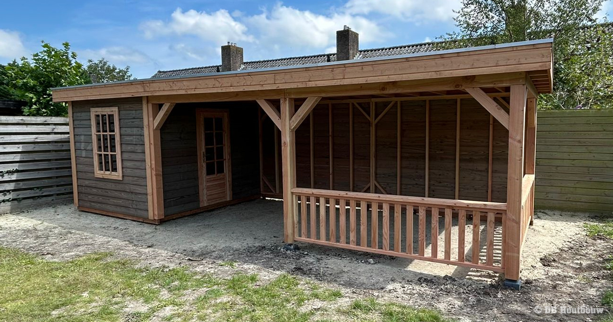 Het dak, betimmert met veer en groef dakbeschot, is afgewerkt met duurzaam EPDM dakbedekking en aluminium daktrim. Het tuinhuis staat stevig gefundeerd op hardhouten balken die in de grond zijn verankerd met hardhouten piketpalen. De vrijstaande palen zijn gefundeerd op een prefab betonpoer met verstelbare plaat. Deze klant kan nog lange tijd genieten van zijn nieuwe aanwinst. Heeft u bepaalde wensen? Neem dan gerust contact op, dan kijken we samen naar wat we voor u kunnen betekenen.